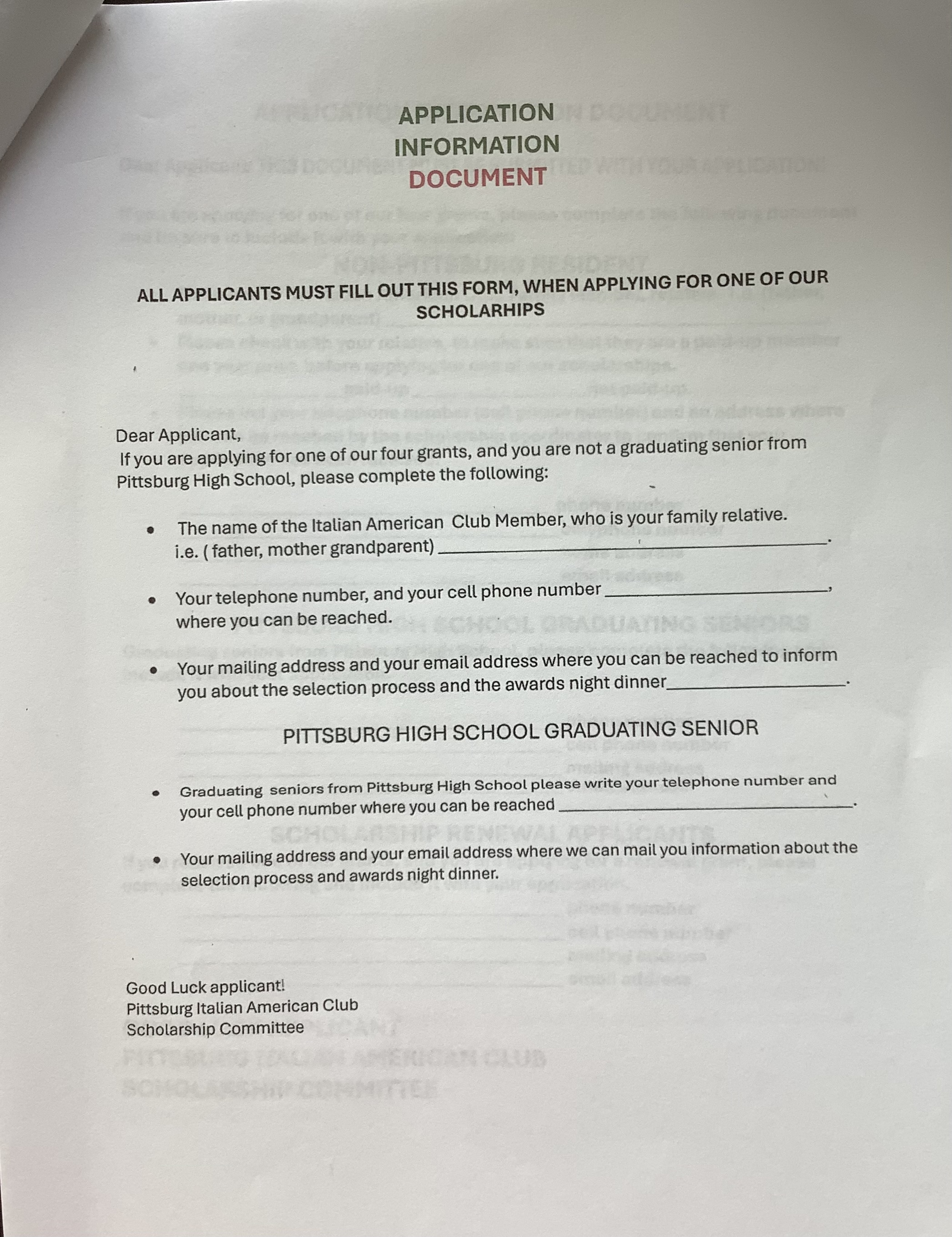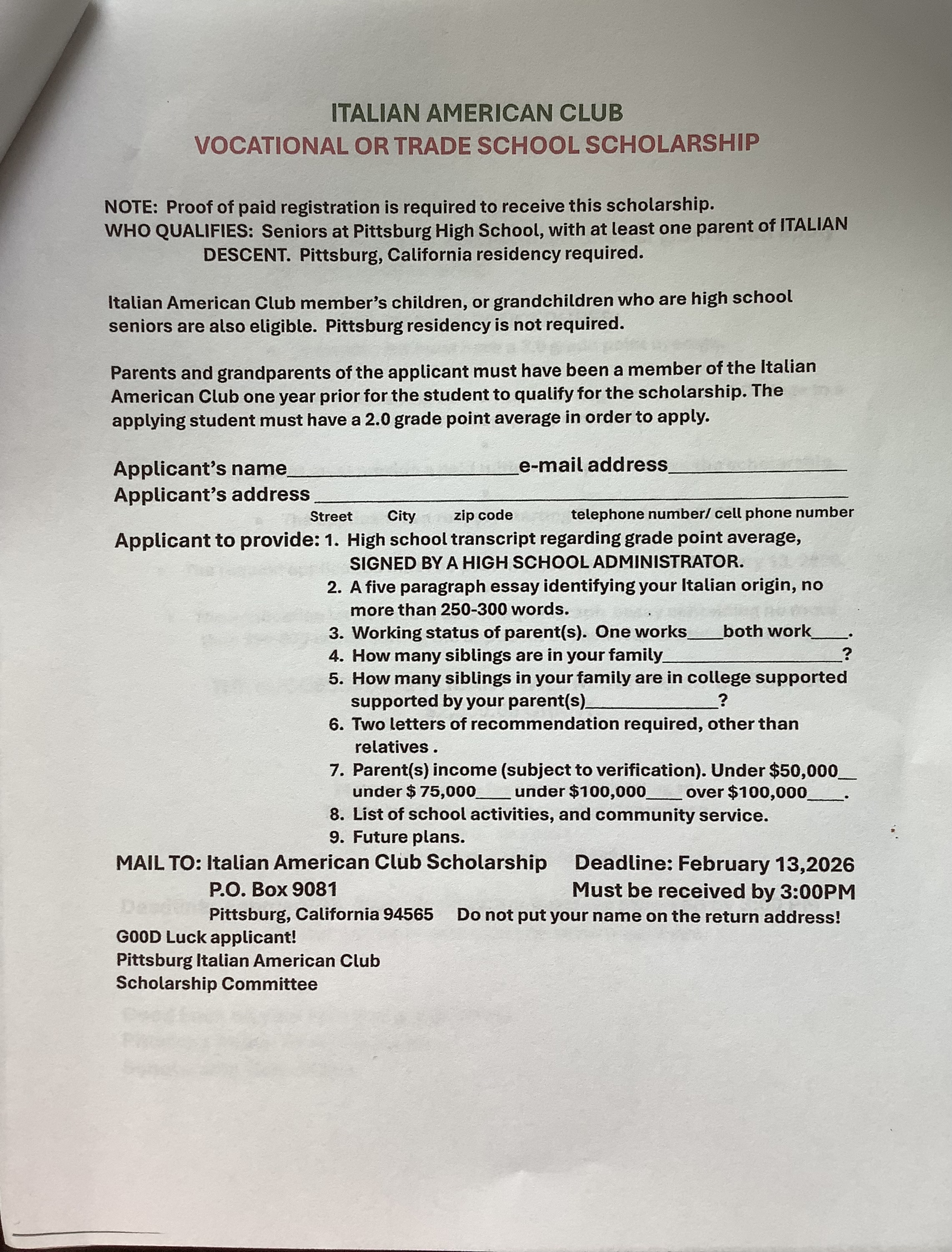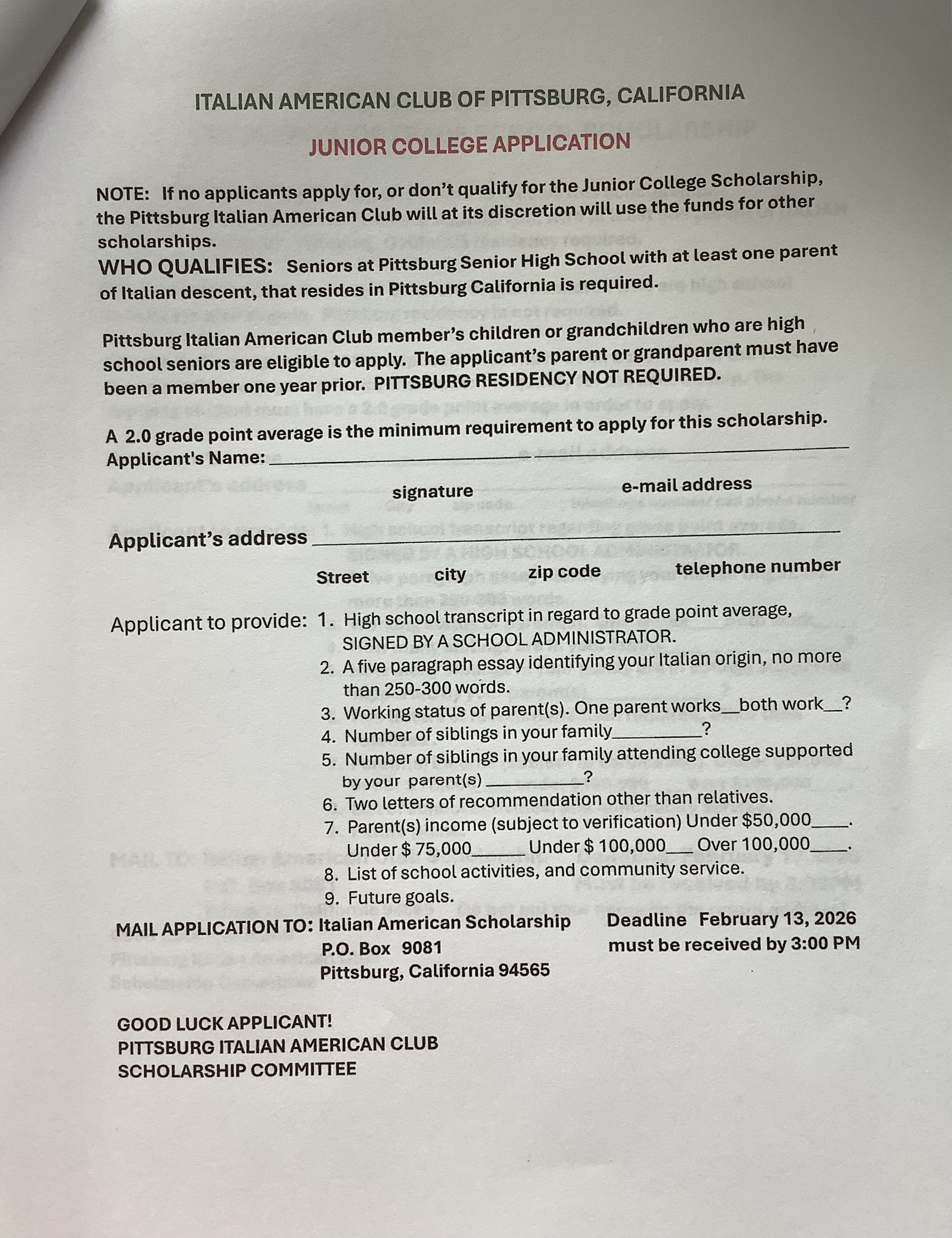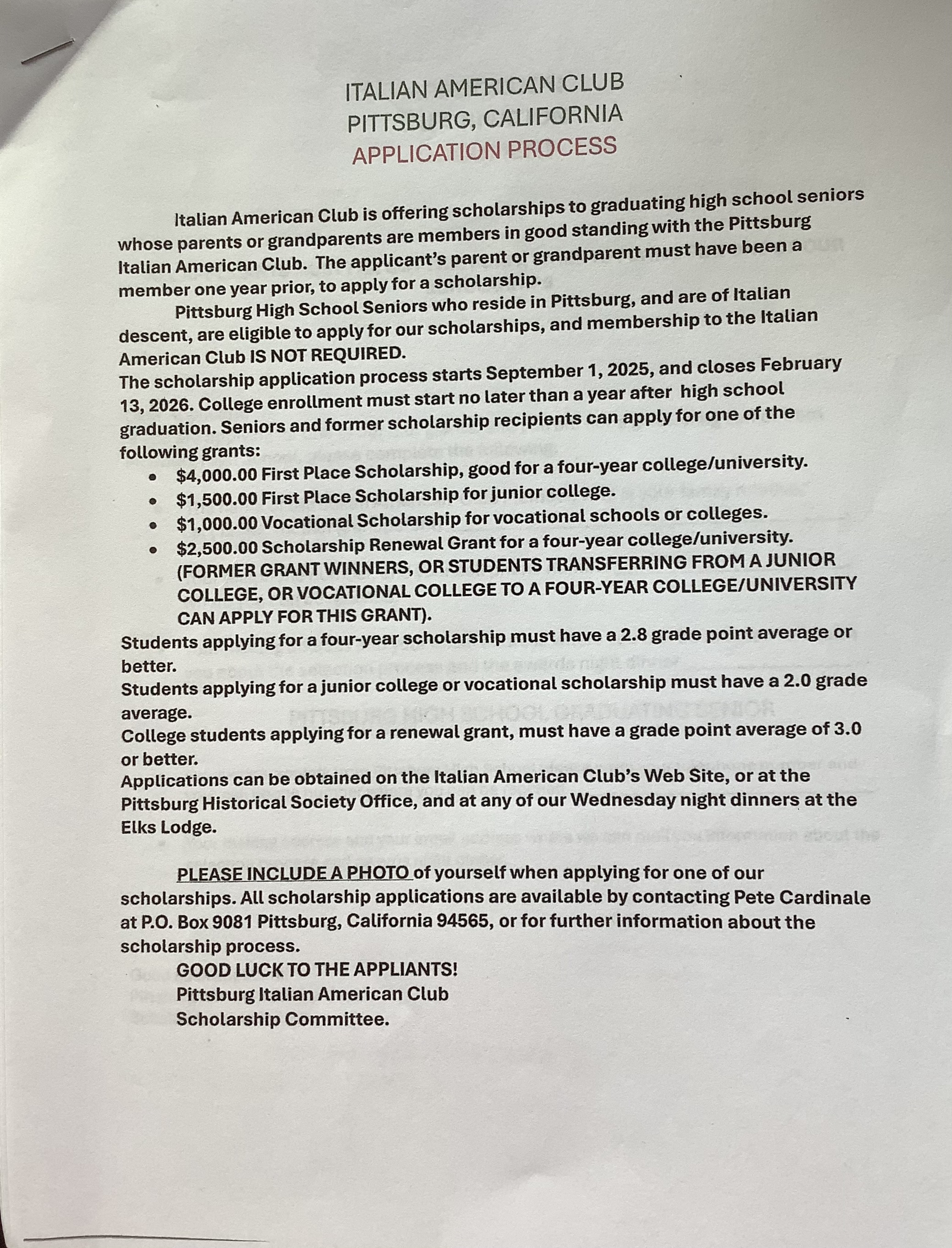 Eligibility for our scholarship is for children and grandchildren of our Regular Members that have been in good standing for one year or more as well as qualifying students from Pittsburg High School.