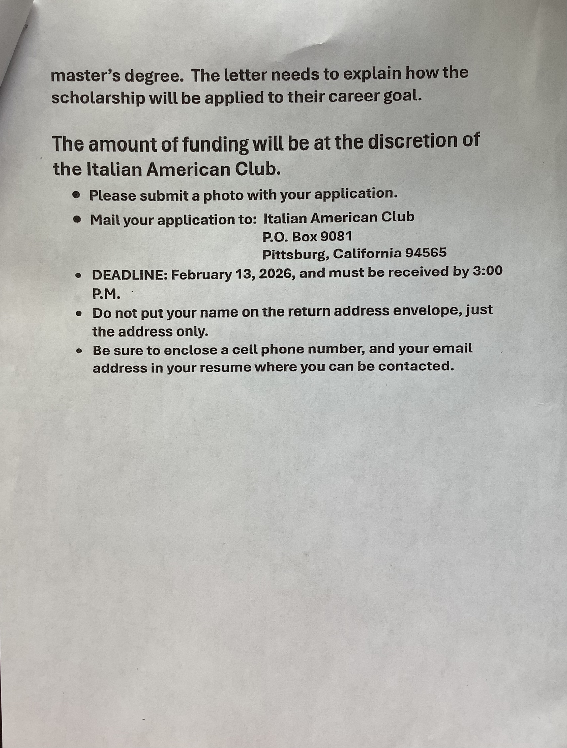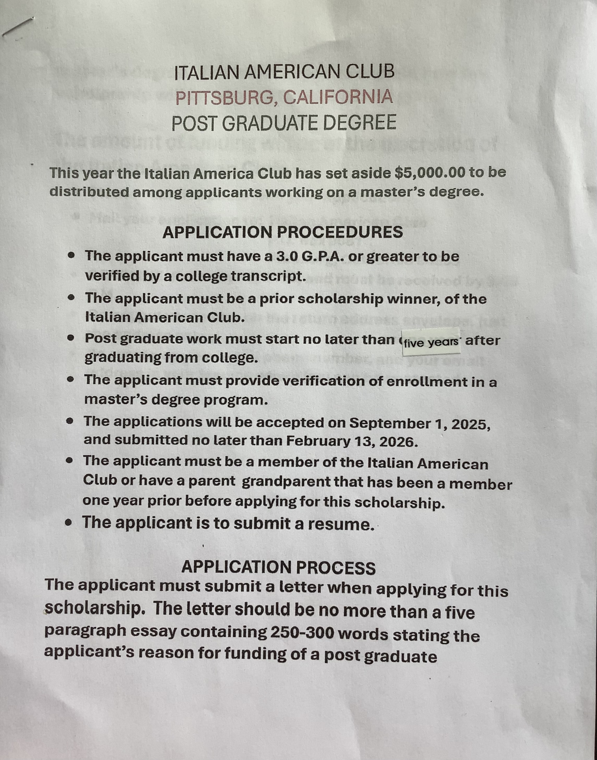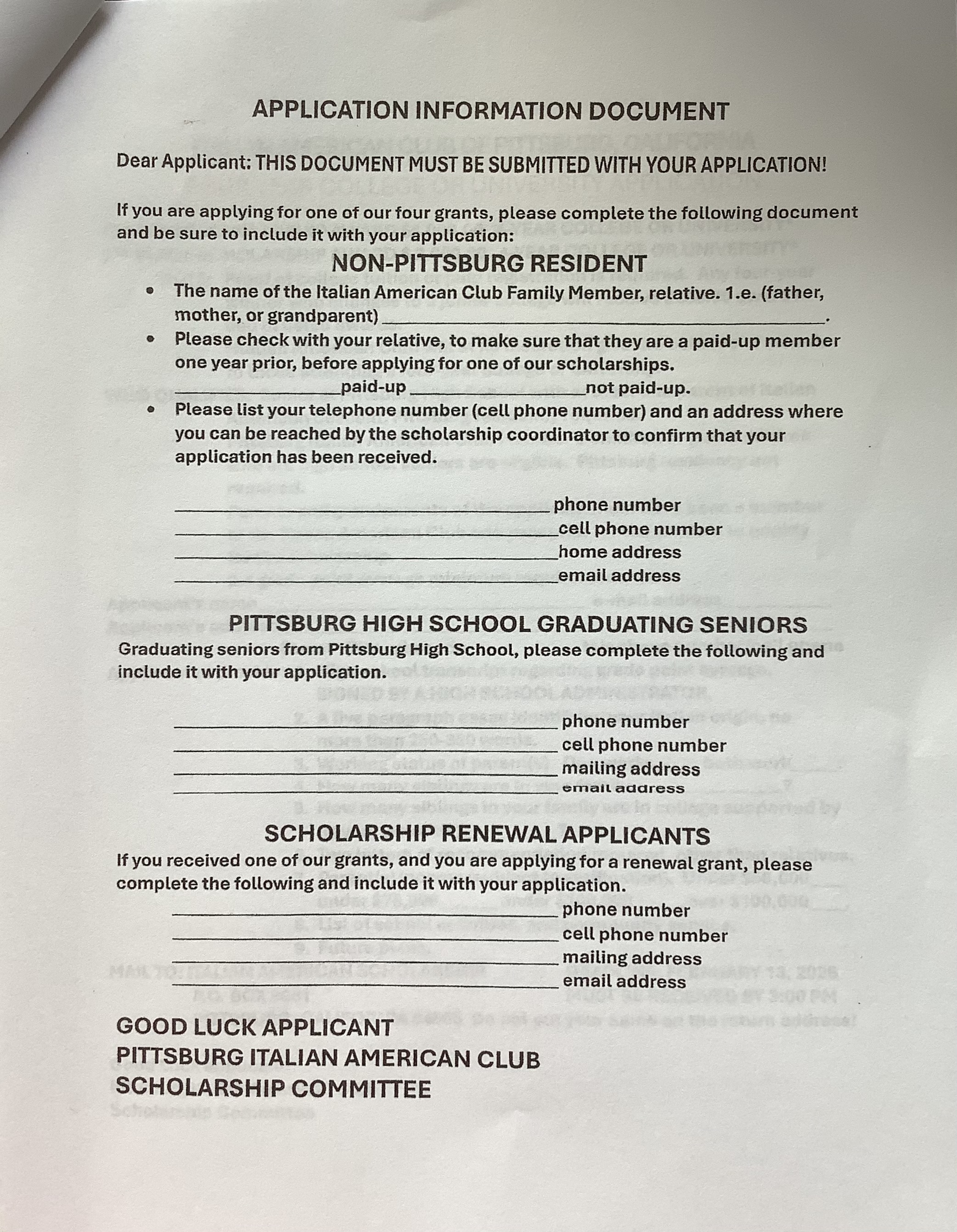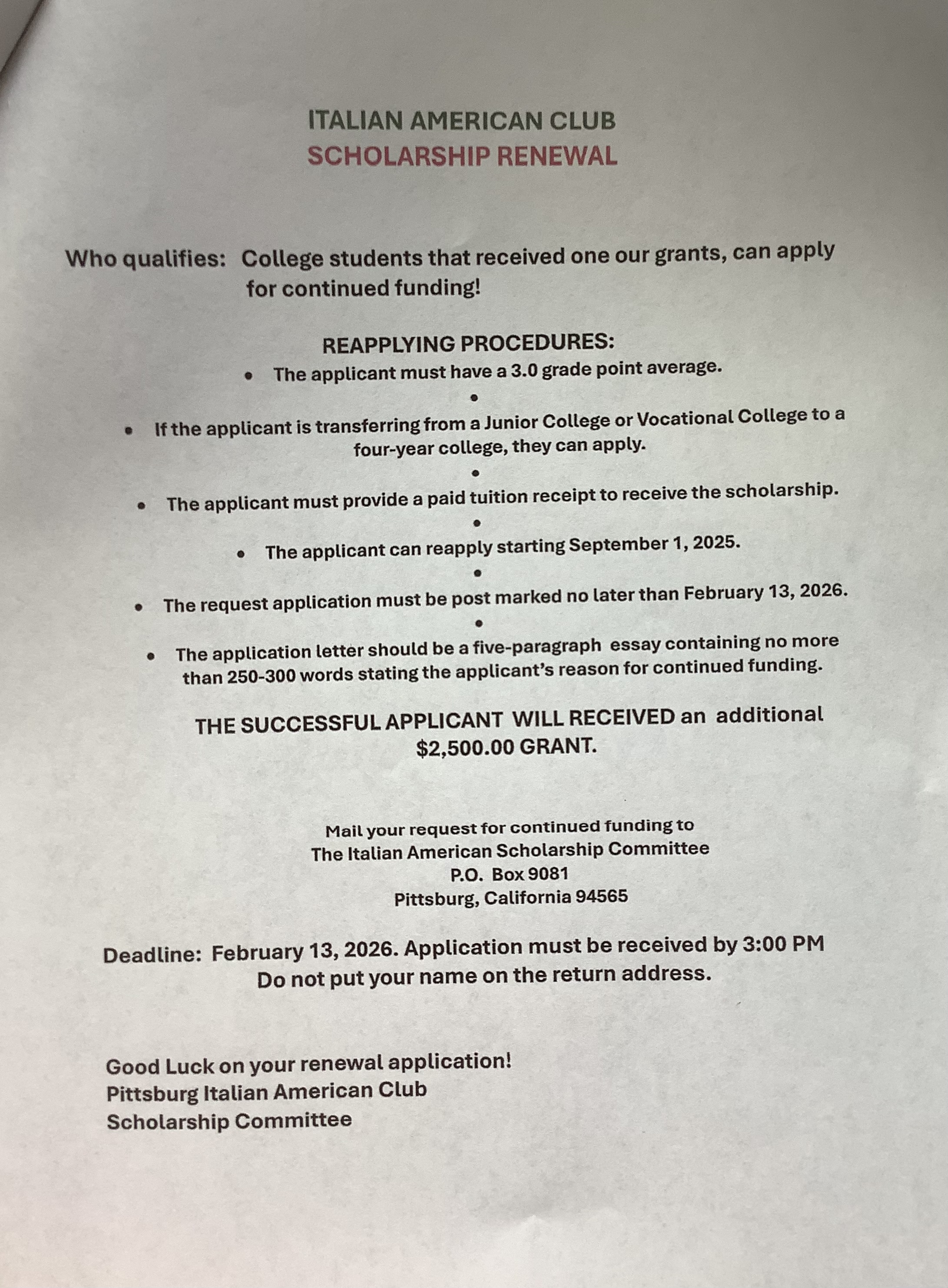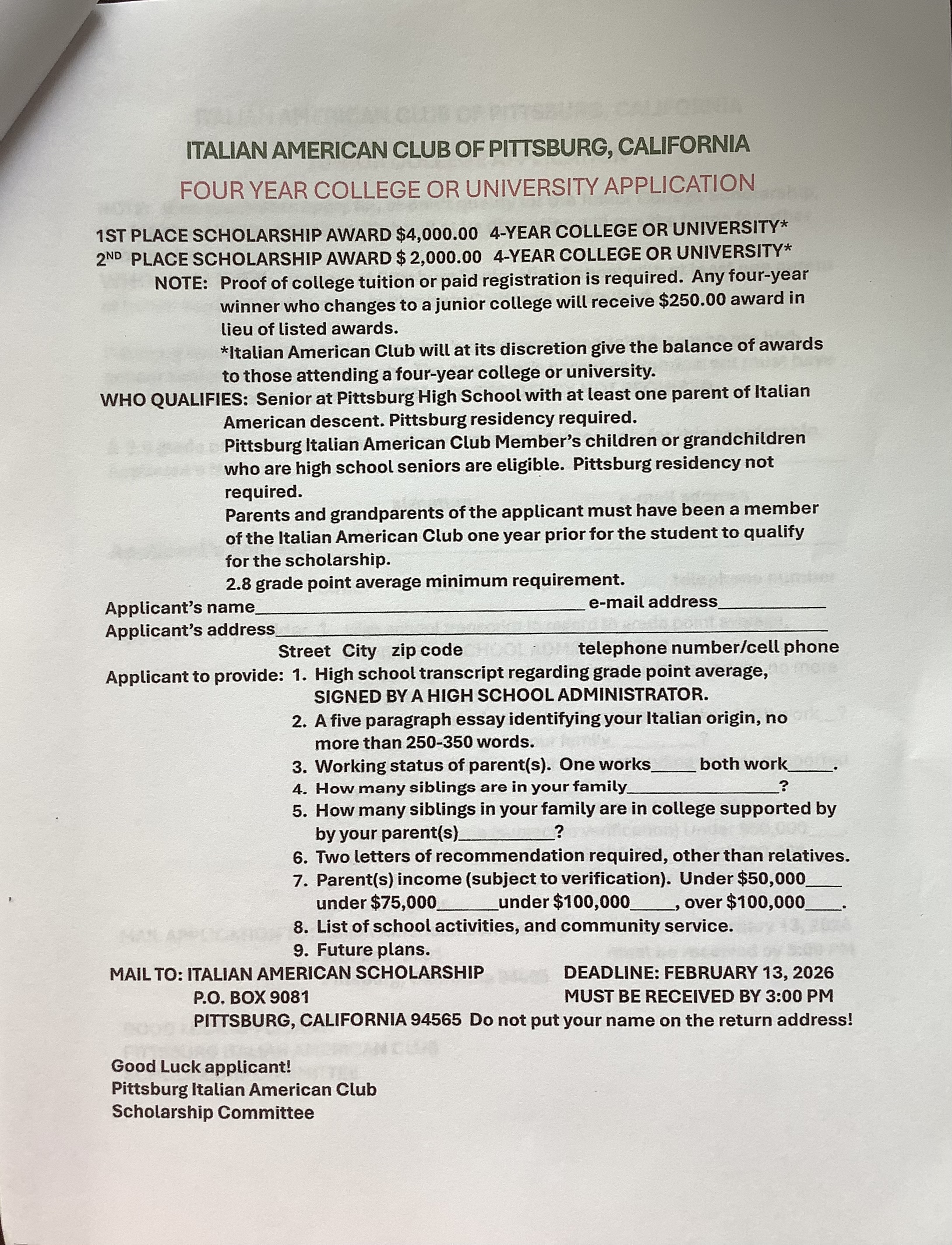 Eligibility for our scholarship is for children and grandchildren of our Regular Members that have been in good standing for one year or more as well as qualifying students from Pittsburg High School.